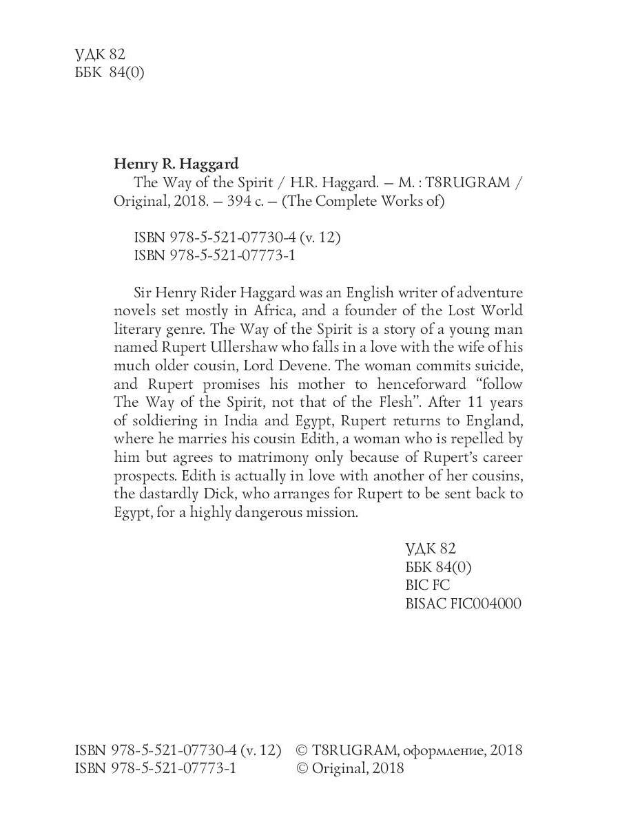 Handling time: 19 days Автор: Haggard H.R., «The Way of the Spirit = Путь духа: на англ.яз»: Sir Henry Rider Haggard was an English writer of adventure novels set mostly in Africa, and a founder of the Lost World literary genre. The Way of the Spirit is a story of a young man named Rupert Ullershaw who falls in a love with the wife of his much older cousin, Lord Devene. The woman commits suicide, and Rupert promises his mother to henceforward "follow The Way of the Spirit, not that of the Flesh". After 11 years of soldiering in India and Egypt, Rupert returns to England, where he marries his cousin Edith, a woman who is repelled by him but agrees to matrimony only because of Rupert's career prospects. Edith is actually in love with another of her cousins, the dastardly Dick, who arranges for Rupert to be sent back to Egypt, for a highly dangerous mission.