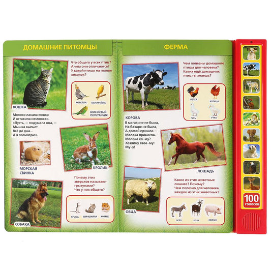 "Умка". 100 голосов животных (10 звуковых кнопок, 100 звуков). 233х302мм, 10 карт. стр. в кор.24шт