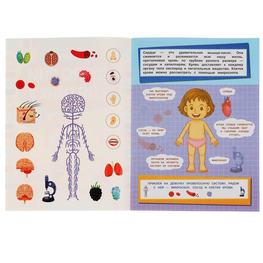 "УМКА". ТЕЛО ЧЕЛОВЕКА. ДОПОЛНИ КАРТИНКУ, 35 НАКЛЕЕК. ФОРМАТ: 160Х215 ММ. ОБЪЕМ: 8 СТР. в кор.50шт