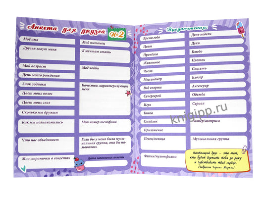 БЛОКНОТИК-АНКЕТА ДЛЯ ТЕБЯ И ДРУЗЕЙ с наклейками. ФИОЛЕТОВАЯ