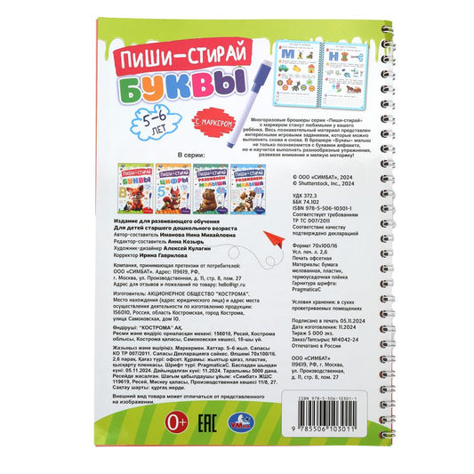 Буквы. 5-6 лет. Многораз. прописи с маркером. Развиваем малыша. 165х240мм.32 стр. Умка в кор.20шт