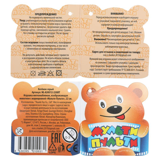Игрушка мягкая кошка серая 22см, без чипа, в пакете МУЛЬТИ-ПУЛЬТИ в кор.24шт