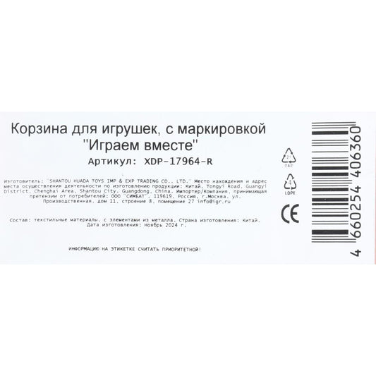 Корзина для игрушек Чебурашка 43*60см ИГРАЕМ ВМЕСТЕ в кор.24шт