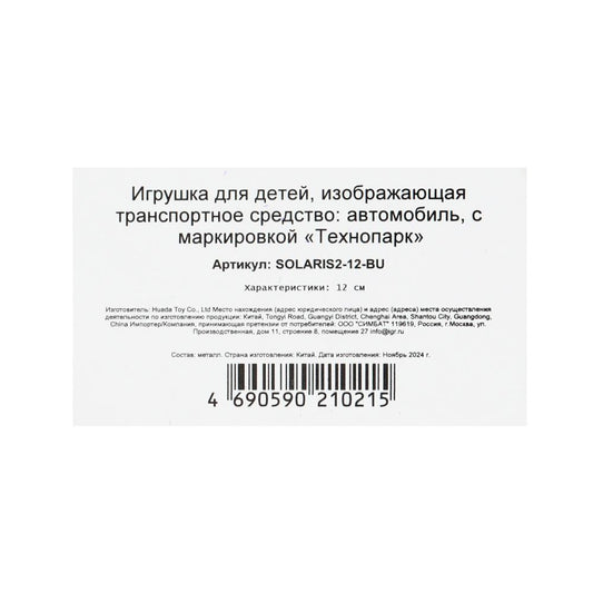 Машина металл HYUNDAI SOLARIS, 12 см, двери, багажник, инерц, синий, кор. Технопарк в кор.2*36шт