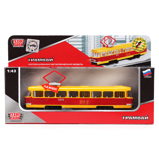 ТРАМВАЙ "ТЕХНОПАРК" МЕТАЛЛ. ИНЕРЦ. 1:43, СВЕТ+ЗВУК, ОТКРЫВ. ДВЕРИ В РУСС. КОР. 16,5СМ в кор.2*24шт