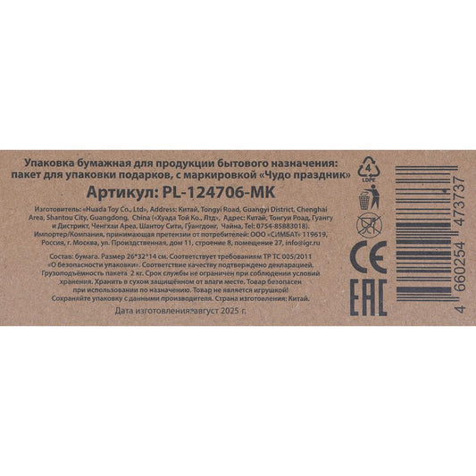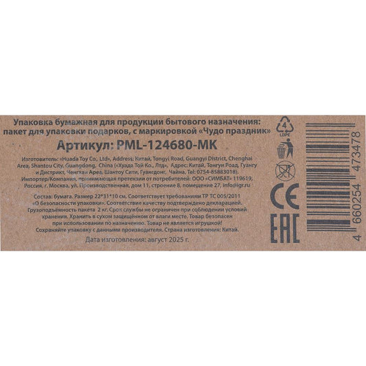 Пакет подарочный крафт мл,мишка,140 гр/м2 ЧУДО ПРАЗДНИК в кор.10*12шт