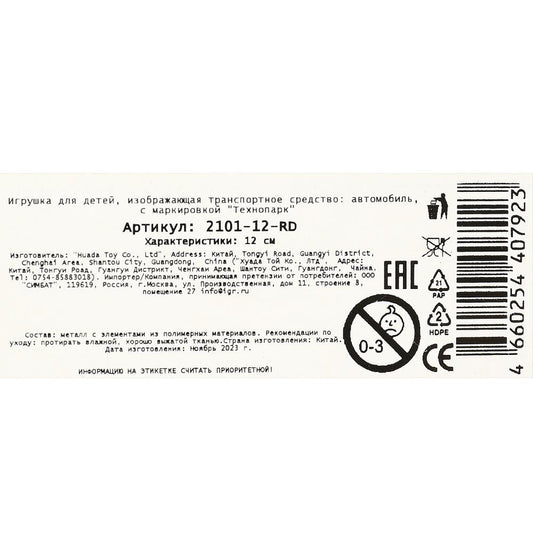 Машина металл ваз-2101 длина 12 см, двери, багажник, инерц, красный, кор. Технопарк в кор.2*36шт