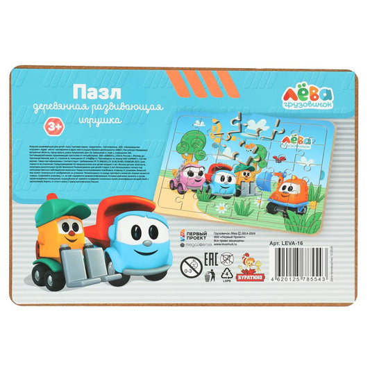 Игрушка деревянная пазл 28*19,5 см. Грузовичок Лева терм. пакет Буратино в кор.28шт
