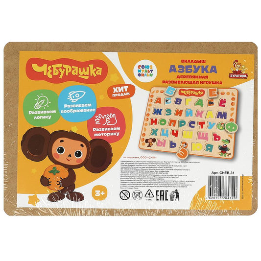 Игрушка деревянная рамка-вкладыш с ручками Чебурашка 17*17 см, термопакет Буратино в кор.20шт