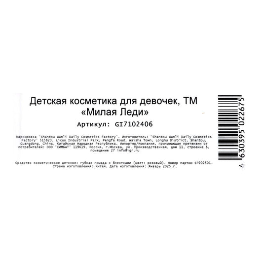 Косметика ДЛЯ ДЕВОЧЕК помада для губ с блестками, розовая МИЛАЯ ЛЕДИ в кор.6*24шт
