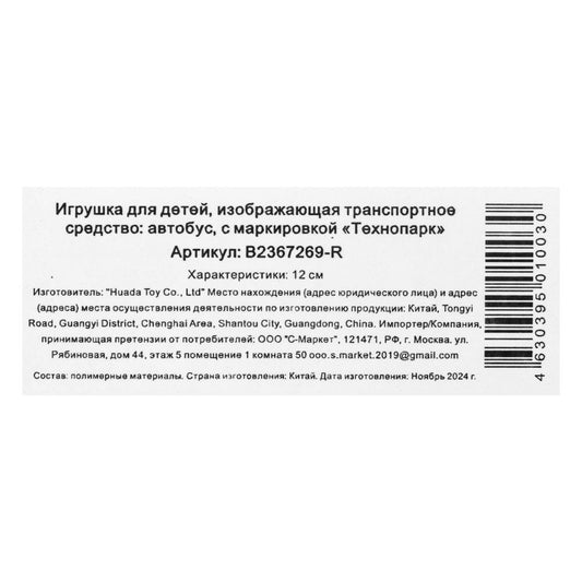 Машина пластик АВТОБУС 12 см, инерция, дверь Технопарк в кор.2*120шт