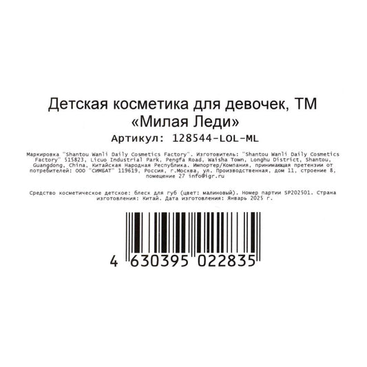 Косметика ДЛЯ ДЕВОЧЕК ЛОЛ блеск для губ 2 мл малиновый МИЛАЯ ЛЕДИ в кор.6*24шт