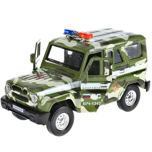 ТМ Технопарк. Машина металл "УАЗ ХАНТЕР ВОЕННЫЙ" 12см, свет+звук, открыватель. двери, инерц. в кор.2*36шт