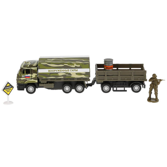 Машина металл Камаз военный 12см, открывающийся. двери, инерц, с прицепом, с аксесс. Технопарк в кор.2*12шт