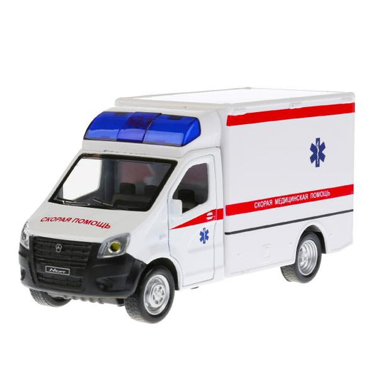 Машина металл свет-звук ГАЗЕЛЬ NEXT СКОРАЯ 15 см, двер, инерц, бел, кор. Технопарк в кор.2*32шт