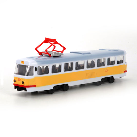 ТРАМВАЙ "ТЕХНОПАРК" ПЛАСТ. 30СМ, СО СВЕТОМ И ЗВУКОМ, ОТКРЫВ. ДВЕРИ 9708B В РУСС. КОР. в кор.24шт