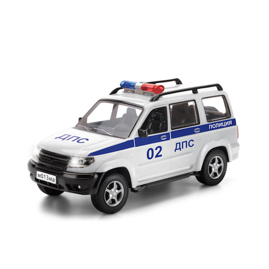 МАШИНА "ТЕХНОПАРК" ПЛАСТ. УАЗ ПАТРИОТ ПОЛИЦИЯ, СВЕТ+ЗВУК, ОТКРЫВ. ДВЕРИ В РУСС. КОР. 21СМ в кор.36шт