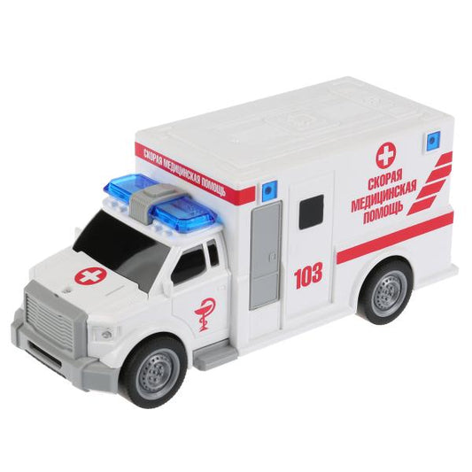 Машина свет+звук "СКОРАЯ ПОМОЩЬ" 19,5см, пластик, инерц., открыв. двери в кор. Технопарк в кор.48шт