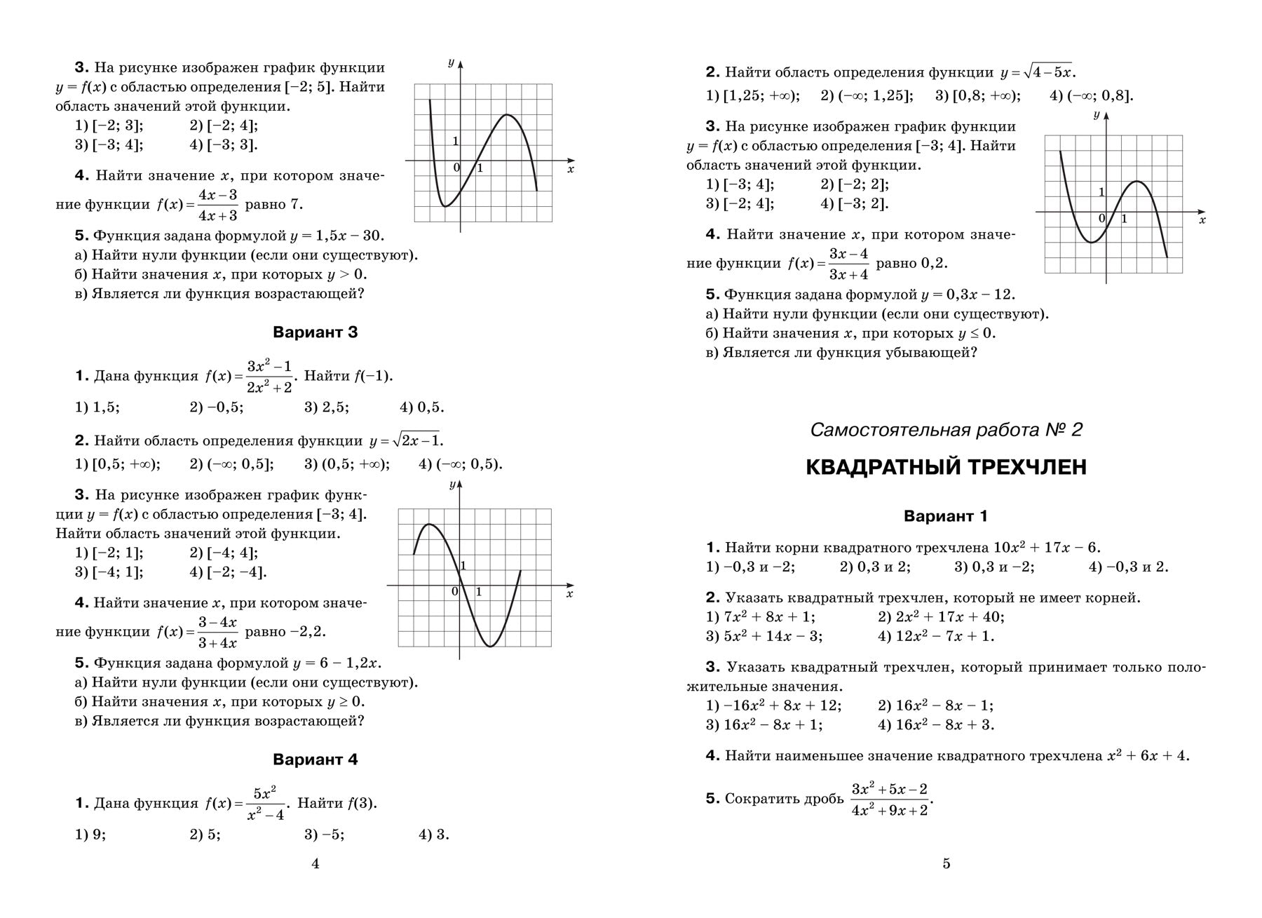 Самостоятельные и контрольные работы даются в четырех вариантах двух уровней сложности: варианты 1 и 2 соответствуют среднему уровню сложности, а 3 и 4 - повышенному и рассчитаны на учащихся, проявляющих особый интерес к математике.