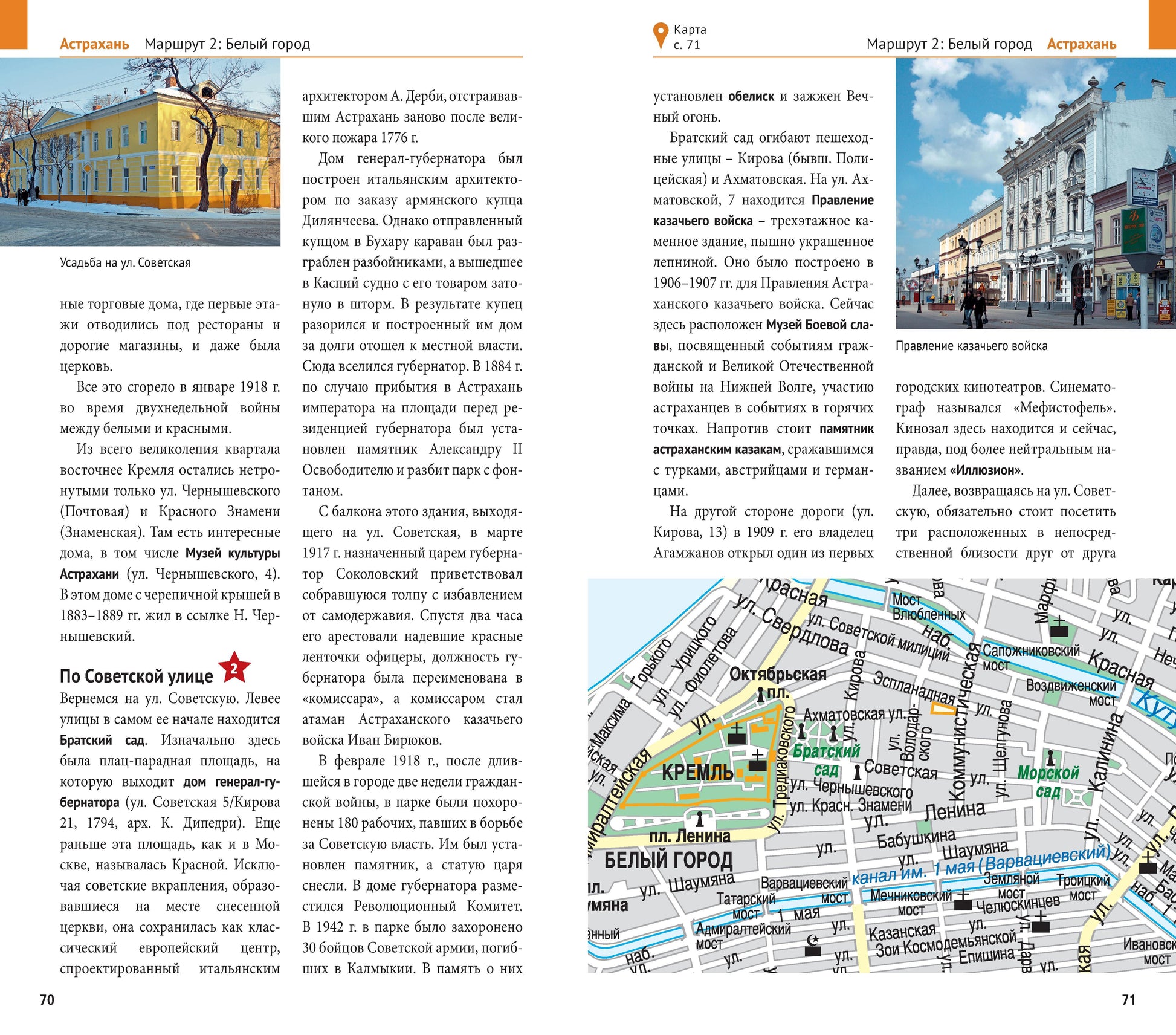 МАРШРУТЫ ПО АСТРАХАНИ Маршрут 1. Прогулка по Кремлю. Маршрут 2. Белый город. Маршрут 3. Квартал Коса. Маршрут 4. Закутумье. Маршрут 5. Дорогой храмов. Маршрут 6. Станица Атаманская. МАРШРУТЫ ПО РЕГИОНУ Маршрут 7. Казачий берег (Астрахань › Старые Тинаки › Нариманов › Вододелитель › Енотаевка › Копановка › Цаган-Аман › Никольское › Грачи › Соленые Займища › Черный Яр › Зубовка › Старица › Каменный Яр › Солодники › Ушаковка). Маршрут 8. Дорога к Богдо (Растопуловка › Хошеутовский хурул › Сарай-Бату › Селитренное › Тамбовка › Урочище Кордон › Харабли и Волго-Ахтубинская пойма › Ахтубинск › Мраморное озеро › Нижний Баскунчак › Озеро Баскунчак › Гора Большое Богдо › Поющие скалы › Зеленый сад › Знаменск › Капустин Яр). Маршрут 9. Калмыцкий рейд (Хулхута › Бэровские бугры › Соляные озера › Заказник «Степной» › Лиман › Оля́ › Вышка › Чертово городище). Маршрут 10. К казахстанской границе (Красный Яр › Мавзолей Букей-хана › Мавзолей Сеид-баба › Алтынжар › Лотосовое поле в Тумаке › Большой Могой › Ильинка › Чуркин › Разино › Цветное). Маршрут 11. В дельту, в дельту (Камызяк › Самосделки › Зоопарк «Баба Фрося»). ПЛАНИРОВАНИЕ ПУТЕШЕСТВИЯ Климат и сезоны туризма
