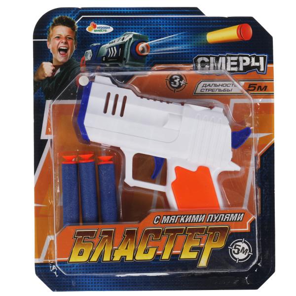 Бластер с мягкими пулями «Смерч» ТМ «Играем вместе» непременно понравится юному герою: - дальность стрельбы 5 м - незабываемый дизайн - 3 мягких пули
