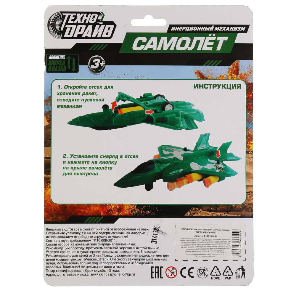 Самолёт ТМ «Технодрайв» станет отличным подарком для маленького авиатора: - стреляет мягкими пулями - движение вперед и назад - 4 пула в комплекте - (поставьте самолет на ровную поверхность, потяните назад, отпустите - и он тут же поедет вперед) Российскому ребёнку обязательно понравится этот незабываемый военный самолёт, который может запускать ракеты из мягкого пуль. Такая игрушка не только развлечет малыша, но и познакомит его с календарем военной техники. Компактный размер позволяет брать самолет с собой на прогулку. Игра с самолётом ТМ «Технодрайв» разрабатывает: - фантазию - моторику - пространственно-образное мышление - логику - Скорость режима Размер: 15 х 15 х 4 см. Материал: пластмасса. Рекомендовано детям от 3-х лет.