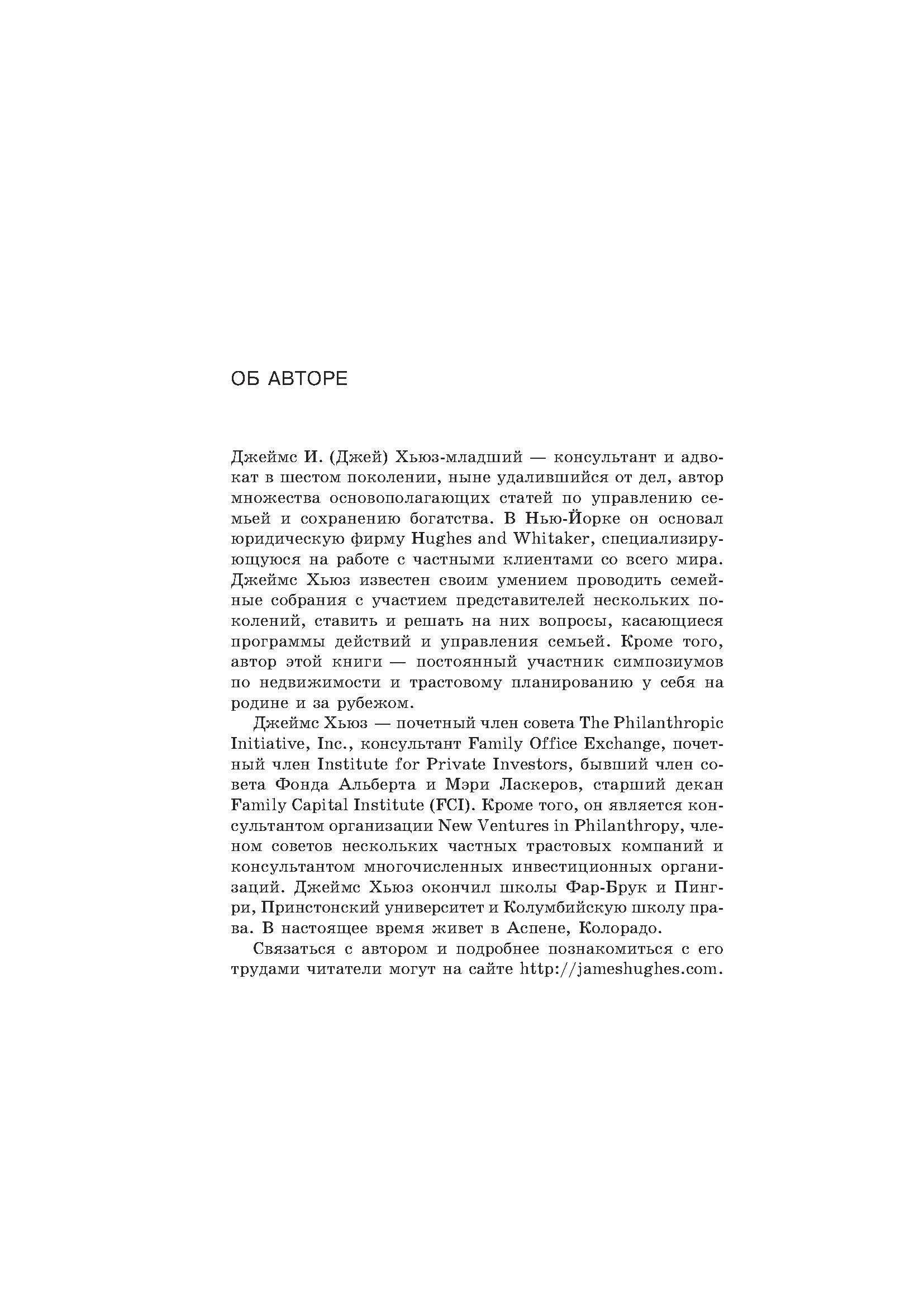 Джеймс Хьюз излагает принципы управления семейным и семейным капиталом и дает практические советы. Он предлагает оригинальную динамику сохранения и приумножения человеческих, интеллектуальных и финансовых активов семьи, используя в своих рекомендациях элементы психологии, антропологии, политической истории, философии, экономических теорий и права. Идеи Хьюза были взяты на вооружение многими семьями, консультантами, учеными и практиками - и все они подтвердили обоснованность разработанных автором методов и методов. Книга составлена для юристов, экономистов, семейных консультантов, а также всех, кто интересуется проблемой сохранения семейных активов. Рекомендуем!