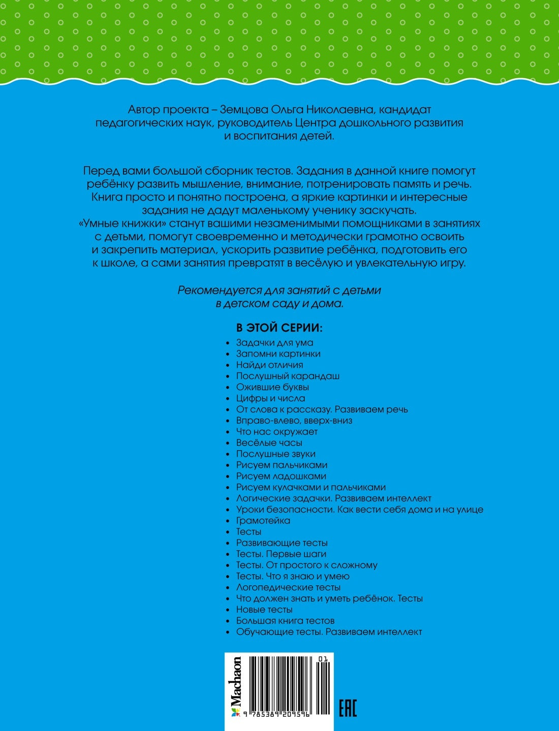 Handling time: 14 days Большая книга тестов (3-4 года) В этой книге вы найдёте разнообразные задания, которые помогут вашему ребёнку развить память, внимание и логическое мышление. Издание предназначено для занятий с детьми 3–4 лет. С книгой легко и удобно работать, и для малышей занятия превратятся в весёлую и увлекательную игру.
