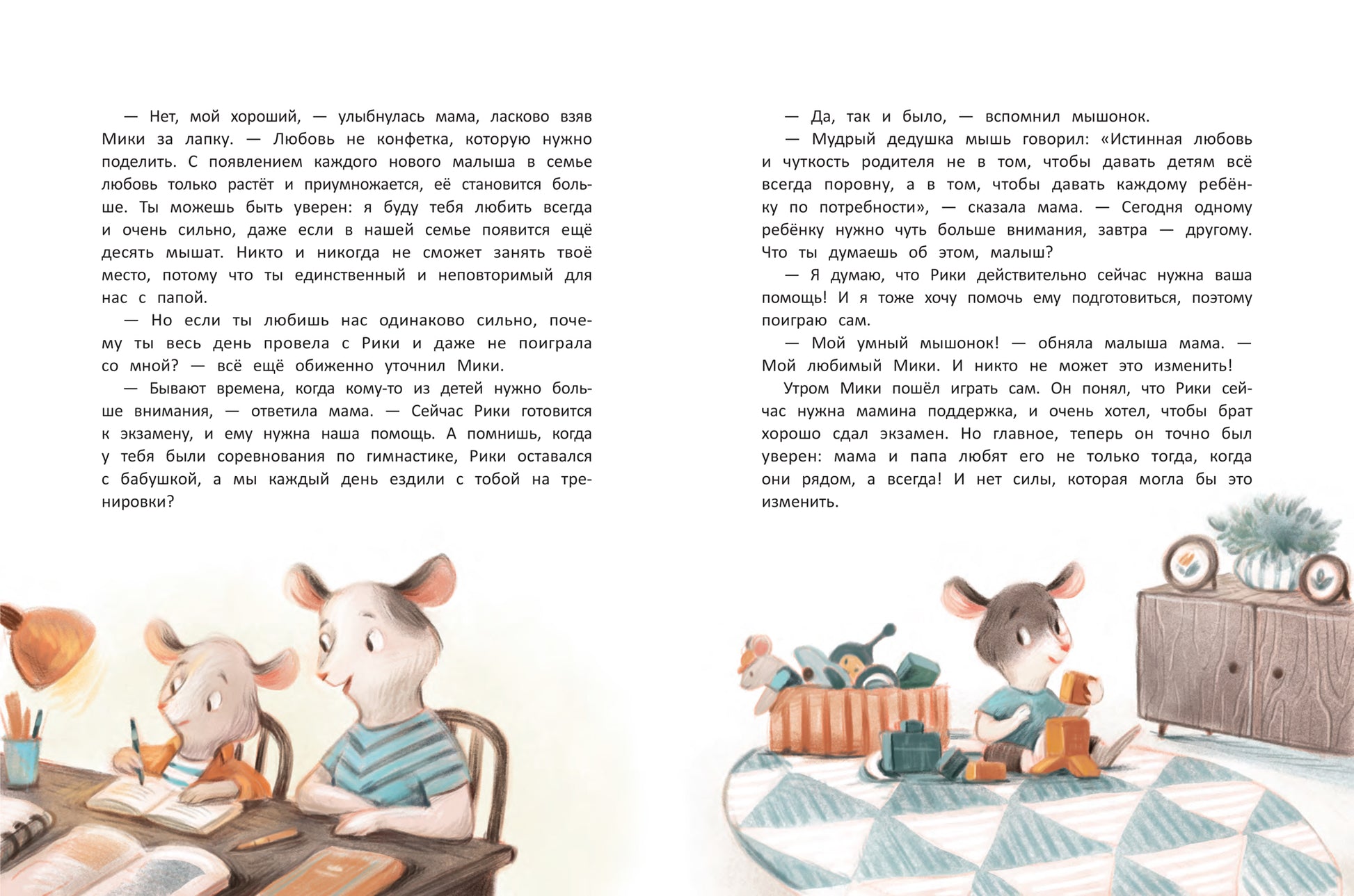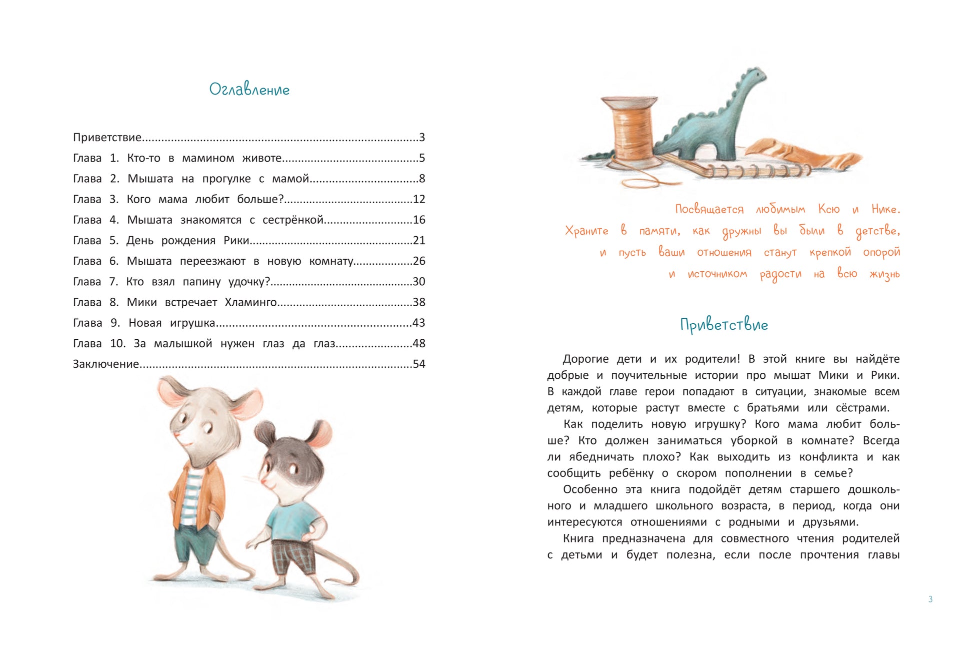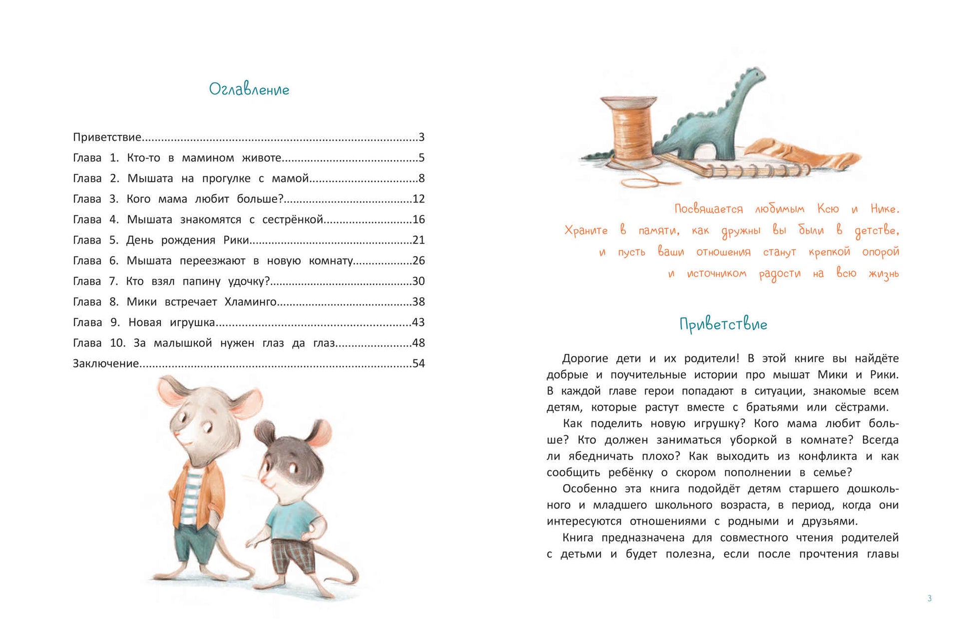 Дорогие дети и их родители! В этой книге вы найдёте добрые и поучительные истории о мышатах Мики и Рики. В каждой главе герои попадают в ситуации, знакомые всем детям, которые растут вместе с братьями или сестрами. Как поделить новую игрушку? Кого мама любит больше? Кто должен заниматься уборкой? Всегда ли ябедничать плохо? Как выходить из конфликта и как сообщить ребёнку о скором пополнении в семье? Мария Шаталова - дипломированный практикующий психолог-консультант, автор блога о детской и семейной психологии @psycholog_na_kuhne. Для детей дошкольного и младшего школьного возраста.