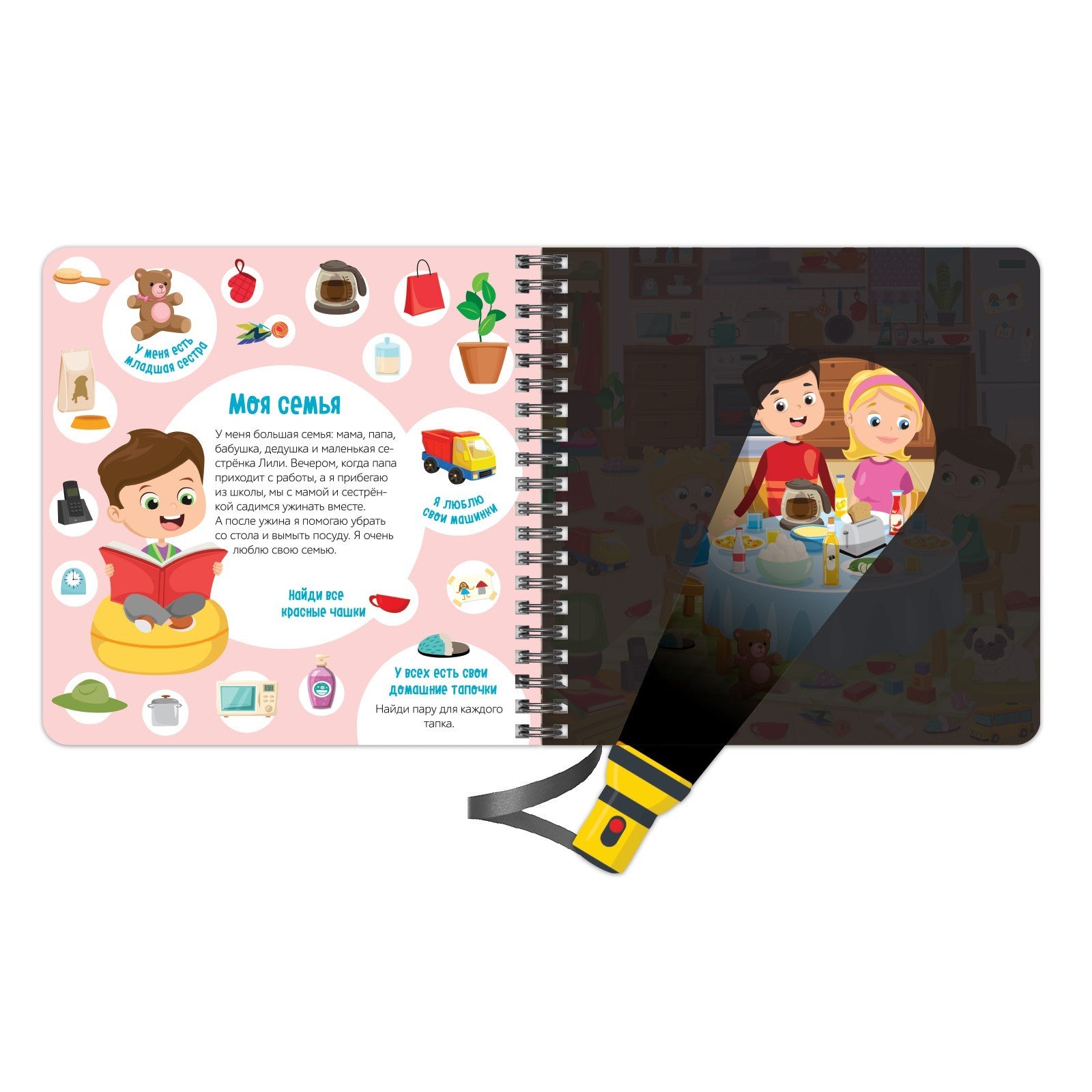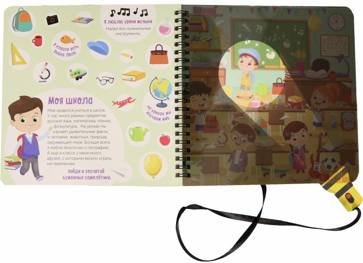 В этой волшебной книге спряталось множество любимых вещей нашего героя Вилли. Он умный и дружелюбный мальчик. И предлагает вашему крохе сыграть с ним в интересную игру, найти потерявшиеся предметы и стать самым внимательным и сообразительным!Для игры вам понадобится фонарик. Он выполнен из картона и привязан к книжке на шнурок.Как разглядеть предметы из комнаты Вилли на чёрных страницах книжки?Возьмите фонарик и вложите его между пластиковой и чёрной страницами.Вы получите яркое изображение на пластиковой странице, где размещаете белую часть фонарика (луч).Остальные части страницы (не под фонариком) остаются в тени.Секретная книга с волшебным фонариком «Найди и покажи с Вилли» привлекает внимание ребёнка своей необычной задумкой.Познавательное пособие рекомендовано для детей старше 3 лет. Оно расширит кругозор малыша. Ребёнок подружится с весёлым мальчиком Вилли и узнает, что окружает его на улице и дома. И много-много всего интересного ждёт вашего кроху с этим озорным мальчишкой!Возьмите фонарик, посветите им на страницу — вы откроете тайны животного мира!Рекомендуется детям от 3 лет.
