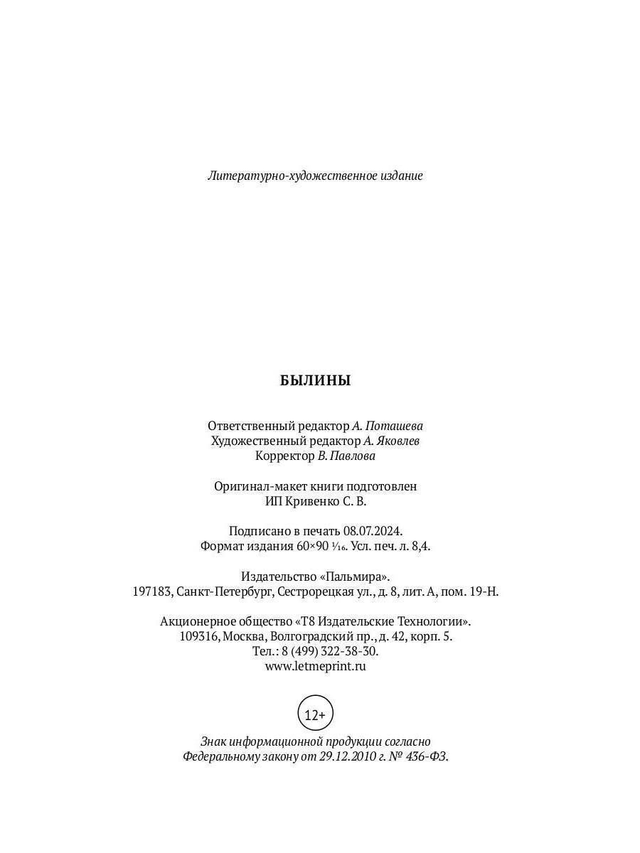 Handling time: 19 days «Былины. Сборник»: В настоящий сборник вошли признанные образцы русского былинного эпоса, записанные фольклористами и этнографами XVIII–XIX веков: П. В. Киреевским, П. Н. Рыбниковым, А. Ф. Гильфердингом и др. Из этих старин (так в народе называли былины) о богатырях и героях - Илье Муромце, Алеше Поповиче, Добрыне Никитиче, Садко и многих других - читатель узнает о старинном быте, воинском оружии, игре на гуслях, женской одежде и украшениях, свадебных обрядах... Былины киевского и новгородского циклов показывают, каким образом сказители осмысляли и сохраняли в коллективной памяти события из истории Древнерусского государства.