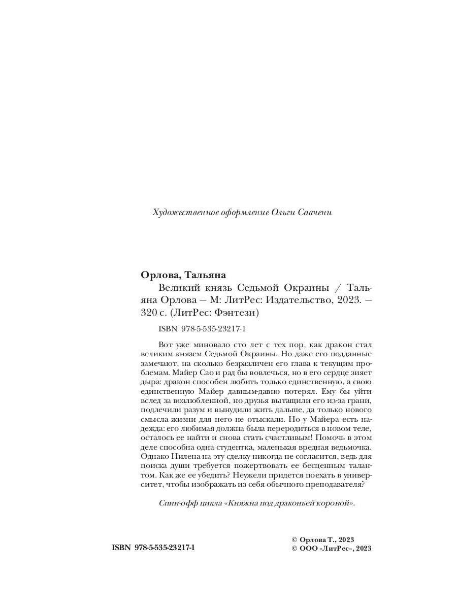 Handling time: 19 days Автор: Орлова Татьяна, «Великий князь Седьмой Окраины»: Вот уже миновало сто лет с тех пор, как дракон стал великим князем Седьмой Окраины. Но даже его подданные замечают, на сколько безразличен его глава к текущим проблемам. Майер Сао и рад бы вовлечься, но в его сердце зияет дыра: дракон способен любить только единственную, а свою единственную Майер давным-давно потерял. Ему бы уйти вслед за возлюбленной, но друзья вытащили его из-за грани, подлечили разум и вынудили жить дальше, да только нового смысла жизни для него не отыскали. Но у Майера есть надежда: его любимая должна была переродиться в новом теле, осталось ее найти и снова стать счастливым! Помочь в этом деле способна одна студентка, маленькая вредная ведьмочка. Однако Нилена на эту сделку никогда не согласится, ведь для поиска души требуется пожертвовать ее бесценным талантом. Как же ее убедить? Неужели придется поехать в университет, чтобы изображать из себя обычного преподавателя?