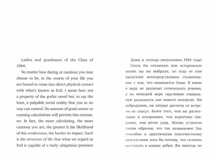 В сборник вошли избранные речи Иосифа Бродского, созданные поэтом в 1980-е годы. Это речь в Шведской королевской академии при получении Нобелевской премии по литературе, "Актовая речь", произнесенная перед выпускниками старейшего в США Уильямс-колледжа, "Похвала скуке", адресованная студентам знаменитого Дартмутского колледжа, а также "Речь на стадионе", обращенная к выпускникам Мичиганского университета. "Речь на стадионе" называют речью, которая изменила мир, а напутствие молодым людям, построенное на библейских мотивах, стало известно как "заповеди Бродского". В настоящем издании эти тексты представлены на английском языке, а также в переводе на русский.