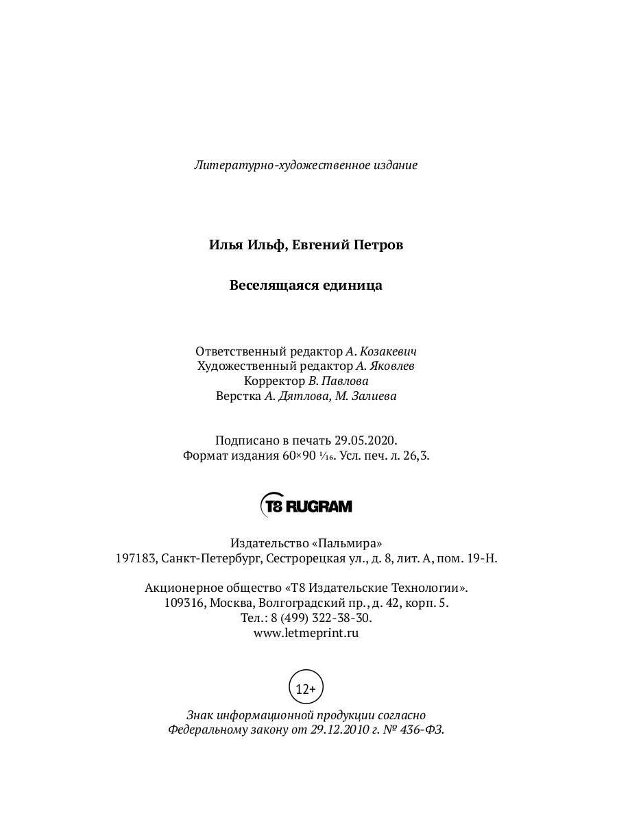 Handling time: 19 days Авторы: Петров Евгений, Ильф Илья, «Веселящаяся единица»: В этот сборник включены рассказы, фельетоны, статьи и речи, написанные в 1932–1937 годах, а также водевили «Сильное чувство» и «Сценарий звукового кинофильма» знаменитого дуэта. Малая проза Ильфа и Петрова искрометна и злободневна, в ней речь идет о насущном, о реальных людях, о фактах. Эти небольшие зарисовки невероятно точно воспроизводят дух эпохи 1930-х годов.