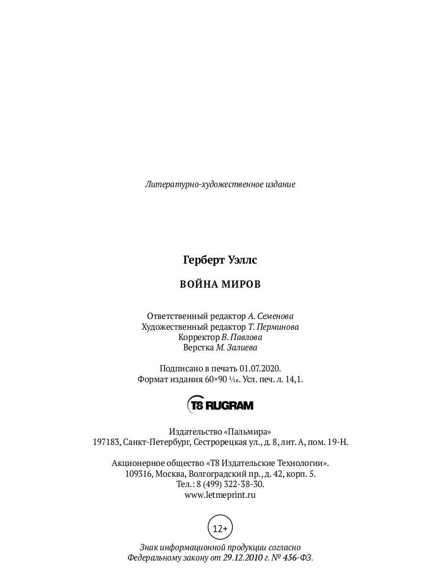 Handling time: 19 days Автор: Уэллс Герберт Джордж, «Война миров»: Роман английского писателя-фантаста Герберта Уэллса (1866-1946) о вторжении марсиан на Землю. Этот сюжет был использован Уэллсом одним из первых в мировой литературе.