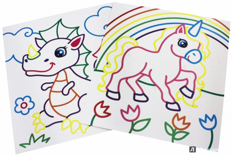 "Волшебные контуры" - цветные контуры отталкивают краску, а цветные линии - подсказка для ребенка каким цветом раскрашивать.Раскрашивая нужные участки картинки, ребенок получит четкие и ровные контуры, а работа получится аккуратная и красочная. Нарисовав своими руками картинку, ребенок может подарить ее маме, папе или бабушке!В наборе 2 картинки для раскрашивания под акварельные краски.Размер: 220х240 мм.Для детей от 3-х лет.