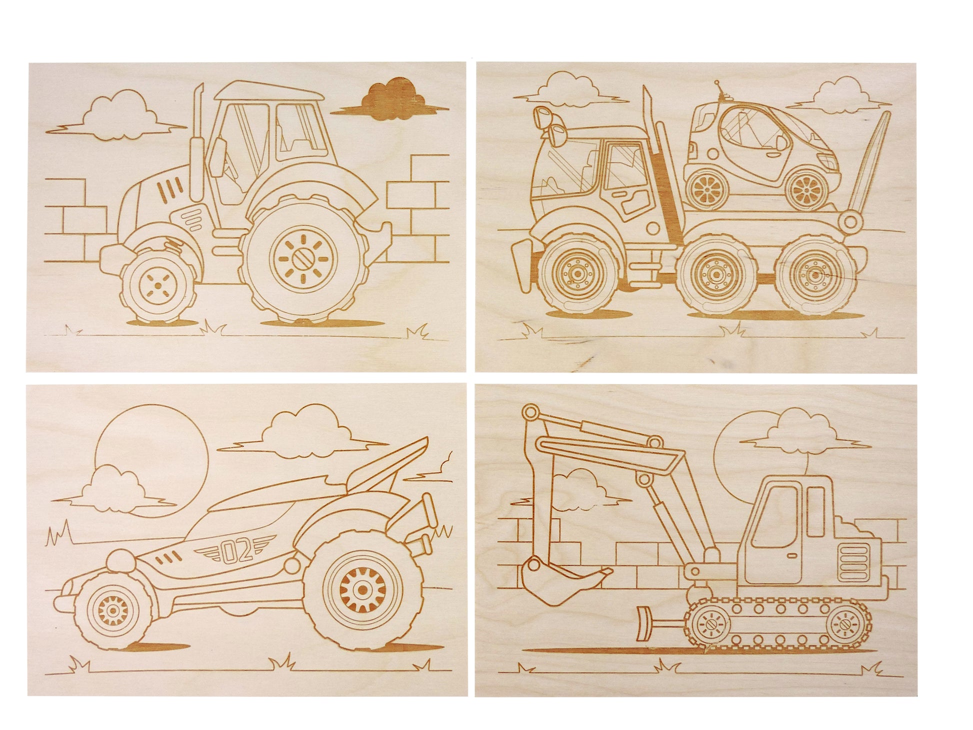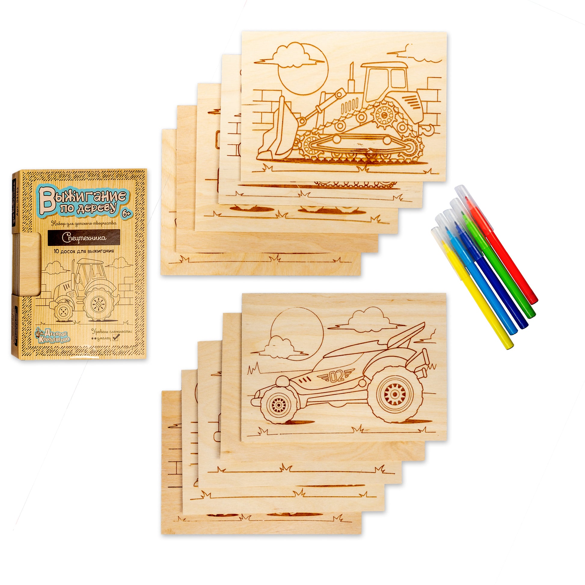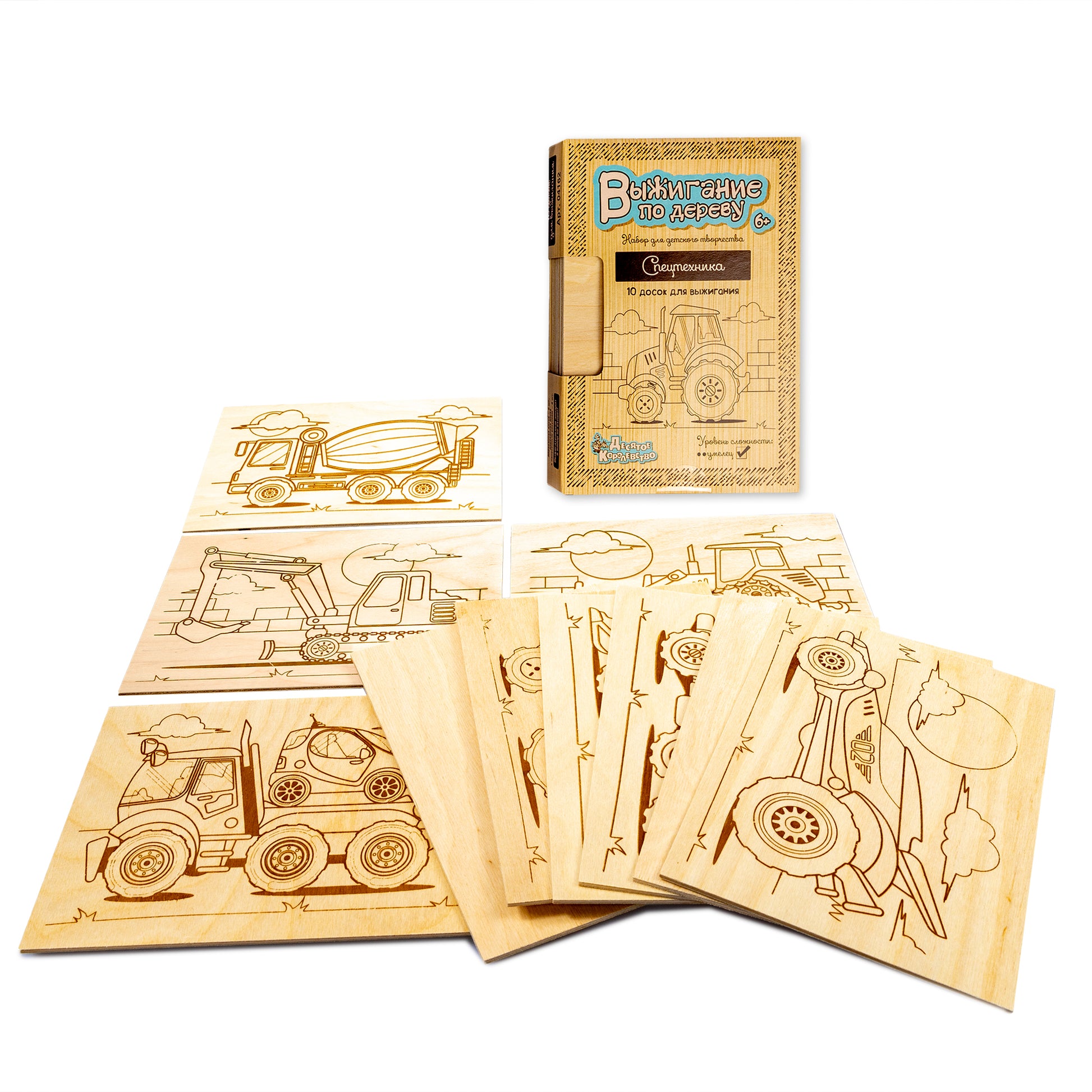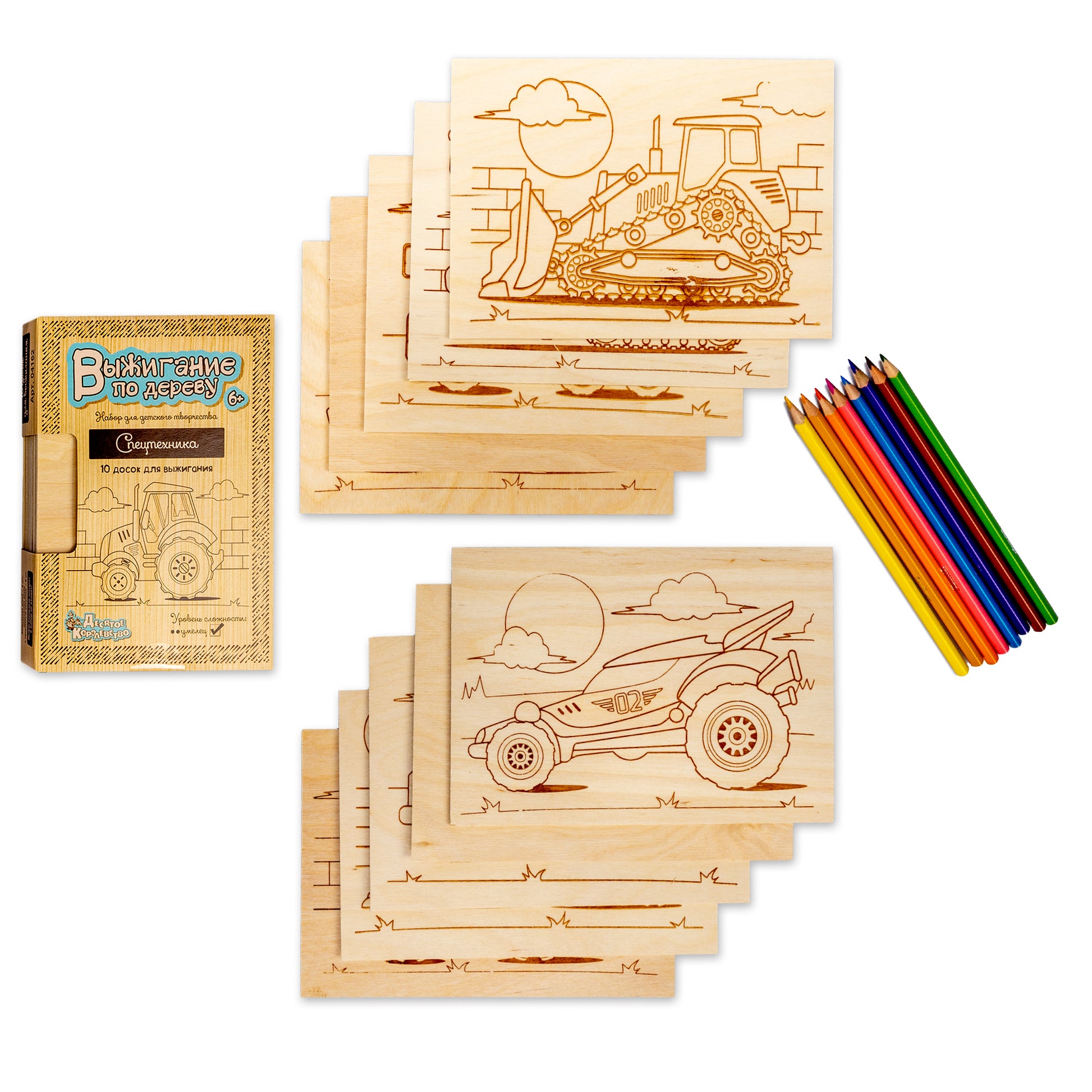 Хотите освоить мастерство выжигания по дереву и создавать свои оригинальные деревянные украшения и аксессуары? Любите машины и технику? начать осваивать мастерство выжигания по дереву с нашим набором досок «Спецтехника».Состав набора:доска с рисунком – 8 шт. (21,3 х 14,8 х 0,5 см)деревянная доска – 2 шт. (21,3 х 14,8 х 0,5 см)С соединительной линией выжигания на рисунке, и у вас получится картинка с точными контурами.Доска изготовлена из массива дерева, рисунок нанесён с помощью красной краски, а не популярной в процессе выжигания вредных веществ.Творческий процесс выжигания развивает мелкую моторику рук, внимание, усидчивость и фантазию.Предназначено для детей от 6 лет.Возжигательный аппарат в наборе не входит.