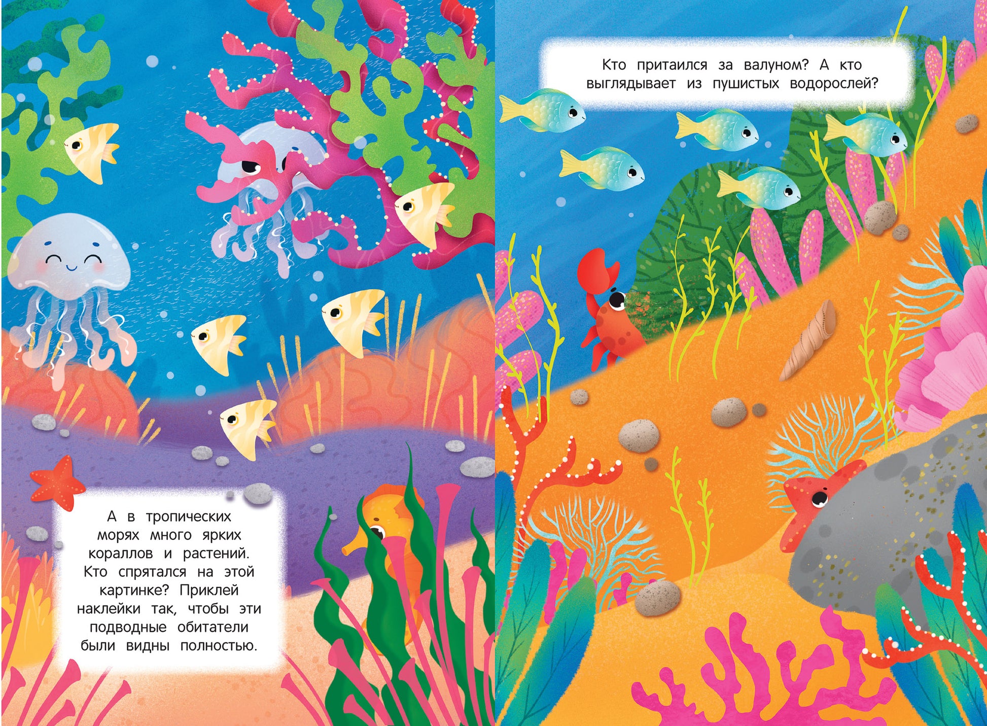 1. Внимательно рассмотрите с малышом картинку и найдите всех спрятавшихся персонажей. 2. Подберите подходящие наклейки и приклейте их на страничку, чтобы персонажи были видны полностью. Теперь назовите знакомые предметы, обсудите увиденное. Хорошей тренировкой станет описание картинки и придумывание историй на основе нарисованного. 3. Эти простые задачи будут полезны для малыша: они помогут развить внимательность и усидчивость, расширят кругозор и улучшат мелкую моторику.