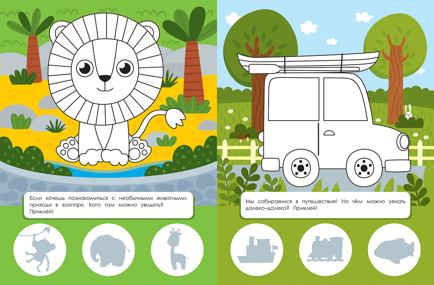 Как работать с этой книгой? Рассмотрите с малышом все иллюстрации, назовите знакомые предметы, обсудите увиденное. После этого предложите раскрасить картинку и к каждой страничке подобрать подходящие наклейки. У изображения и наклеек должен быть общий признак: это могут быть овощи, птицы, транспорт, игрушки, выполняя подобные задания, ребёнок учится логически мыслить и тренирует мелкую моторику.