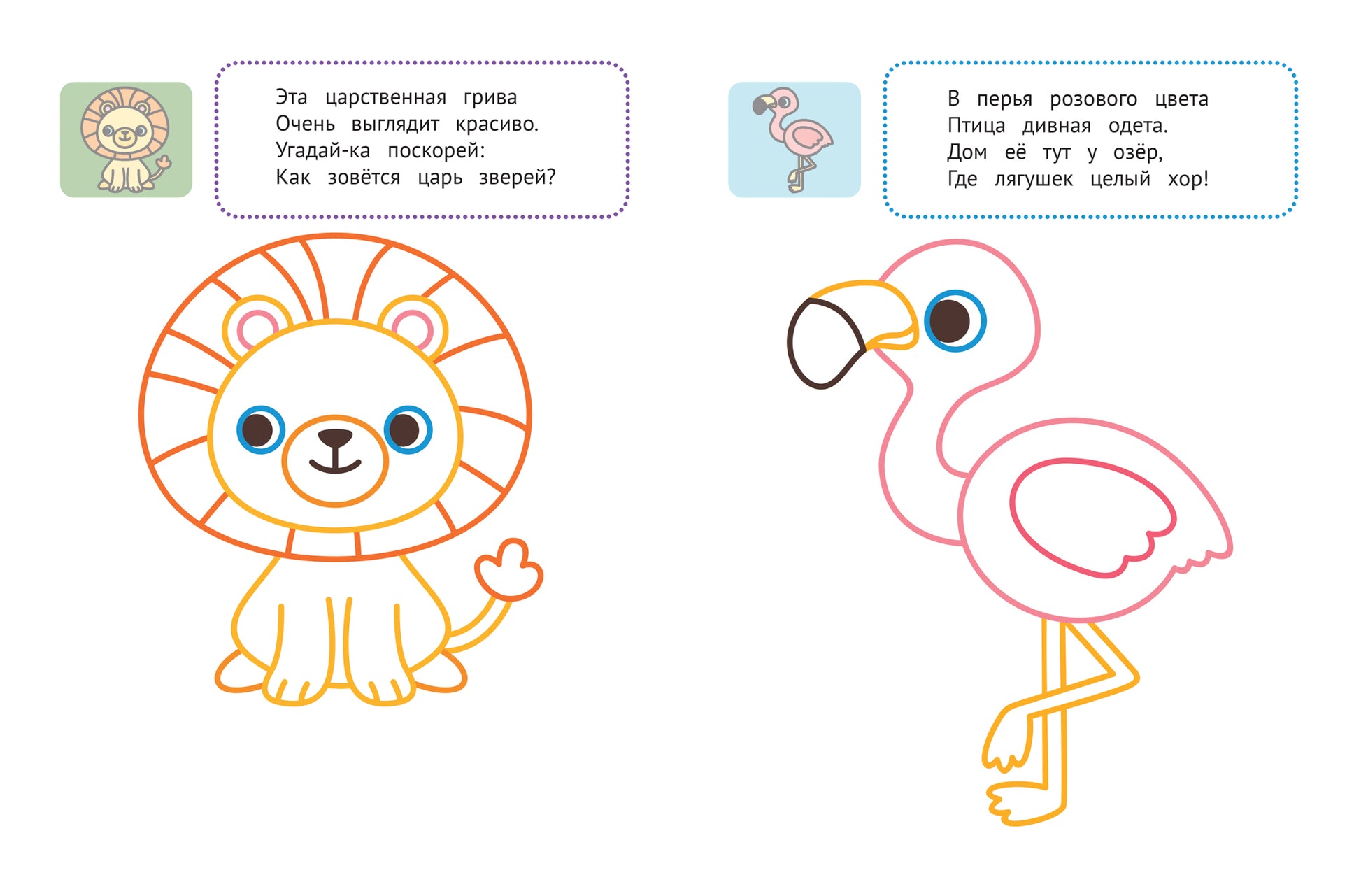 1. Прочитайте загадку, предложите ребёнку дать ответ. Затем рассмотрите иллюстрацию. Звери, птицы, машины - все объекты изображены узнаваемо и просто.