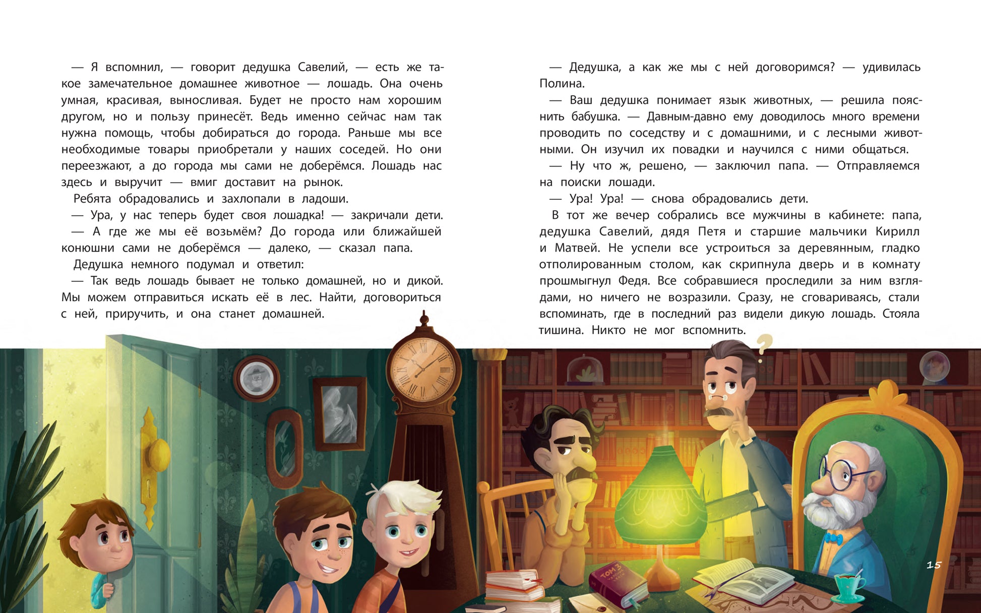 И вот однажды семья решает завести домашнее животное. Да не простое, а обязательно большое, доброе и выносливое. Выбор падает на лошадку. Но где её взять? Дедушка Савелий предлагает отправиться в лес и приручить дикое животное. По дороге путники мокнут под дождём, сталкиваются с "настоящим" волком, находят клад с драгоценными камнями и, конечно, встречают нового друга - лошадку.