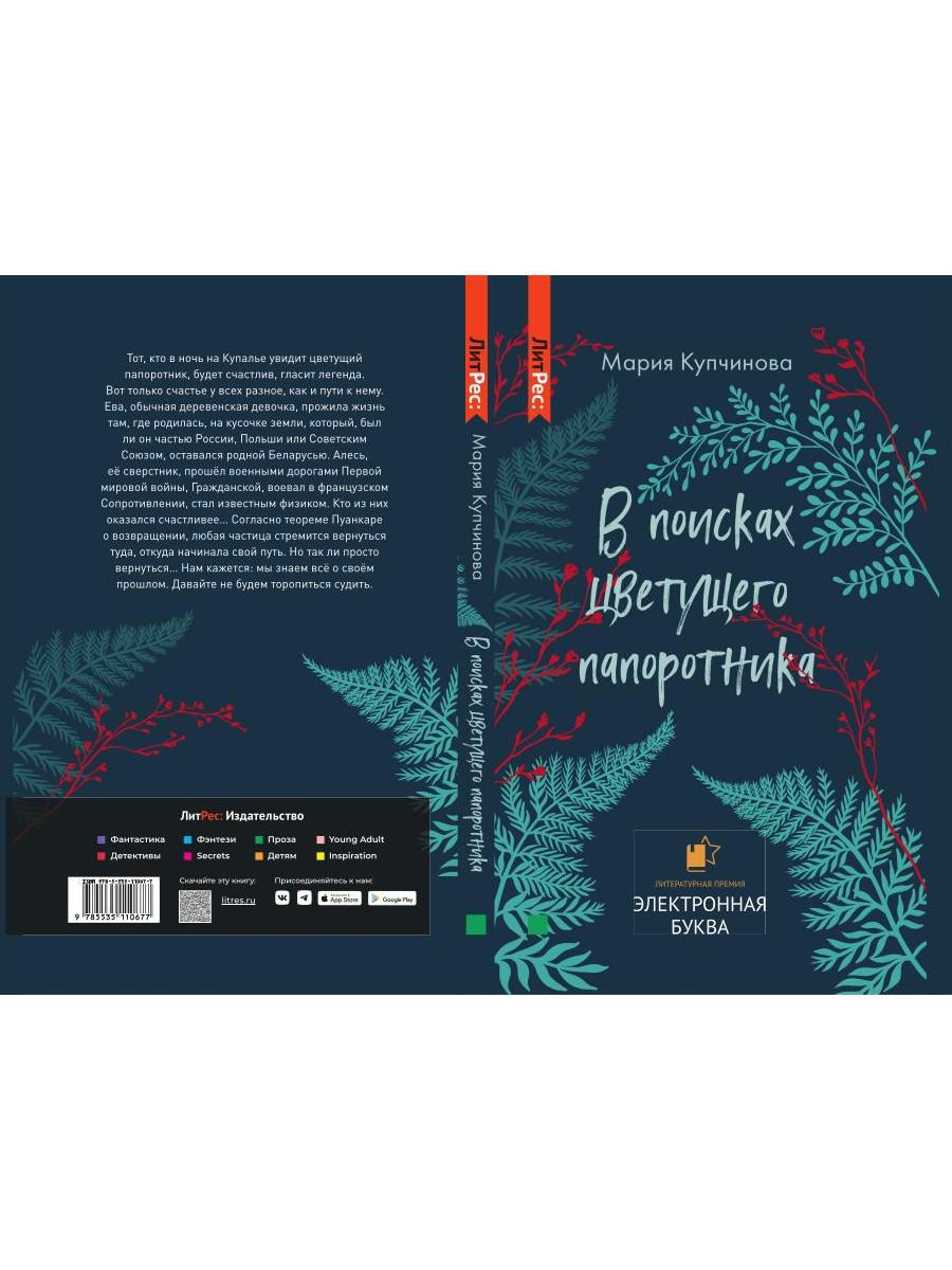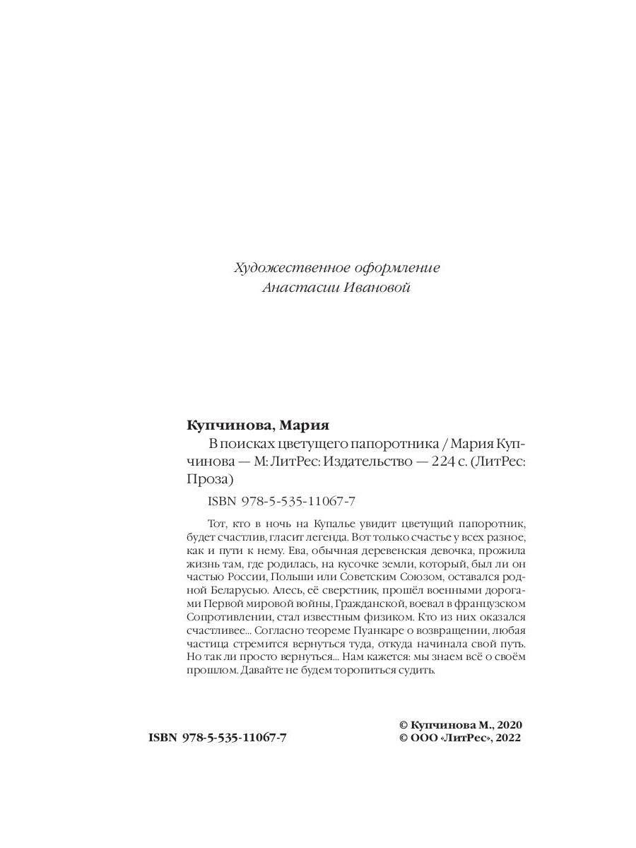 Handling time: 19 days Автор: Купчинова М., «В поисках цветущего папоротника»: Тот, кто в ночь на Купалье увидит цветущий папоротник, будет счастлив, гласит легенда. Вот только счастье у всех разное, как и пути к нему. Ева, обычная деревенская девочка, прожила жизнь там, где родилась, на кусочке земли, который, был ли он частью России, Польши или Советским Союзом, оставался родной Беларусью. Алесь, её сверстник, прошёл военными дорогами Первой мировой войны, Гражданской, воевал в французском Сопротивлении, стал известным физиком. Кто из них оказался счастливее… Согласно теореме Пуанкаре о возвращении, любая частица стремится вернуться туда, откуда начинала свой путь. Но так ли просто вернуться… Нам кажется: мы знаем всё о своём прошлом. Давайте не будем торопиться судить.
