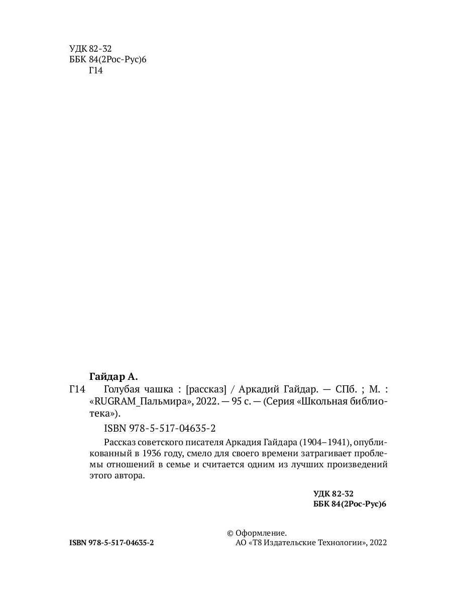 Handling time: 19 days Автор: Гайдар Аркадий, «Голубая чашка»: Аркадий Гайдар (1904–1941) — советский писатель, участник Гражданской и Великой Отечественной войн, классик детской литературы, прославившийся произведениями о настоящей дружбе и боевом товариществе. Рассказ «Голубая чашка», опубликованный в 1936 году, считается одним из лучших его произведений. Смело для своего времени автор затрагивает проблемы отношений в семье.