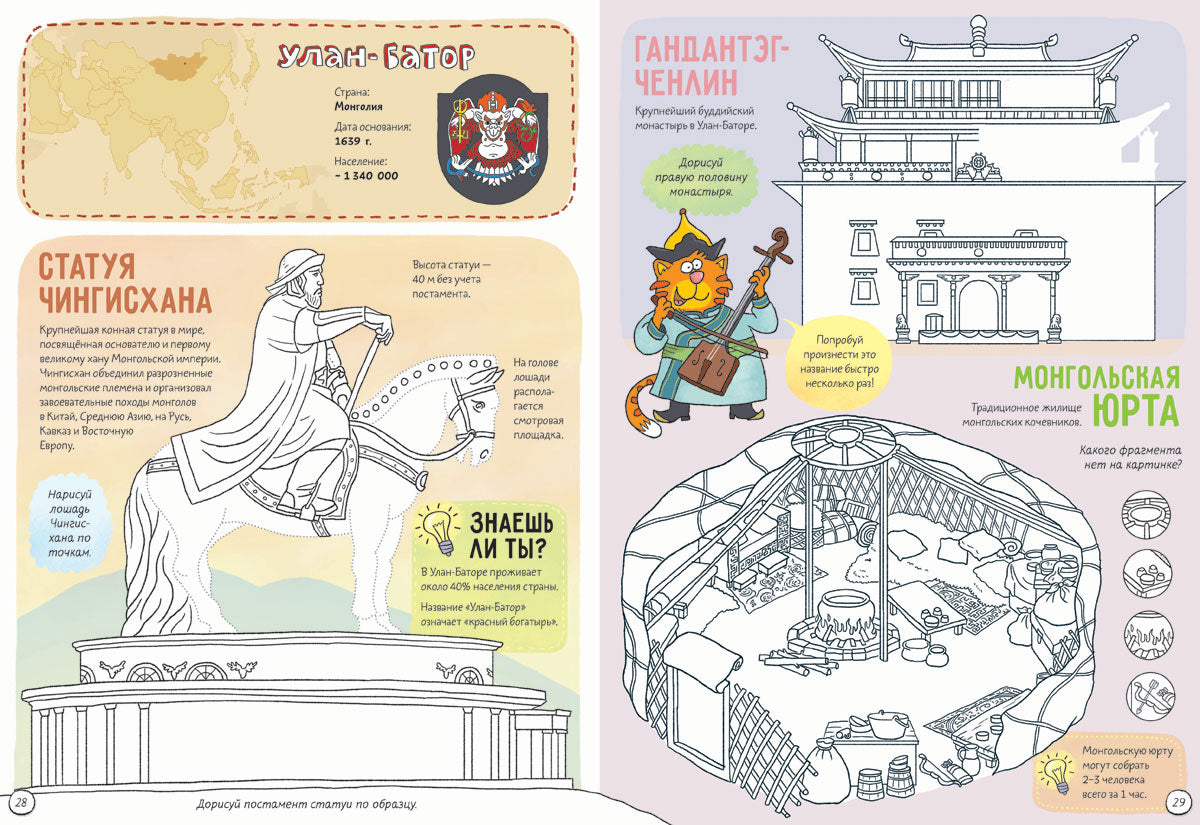 Handling time: 19 days Кот Батон продолжает вояж по удивительной Азии! На этот раз путь его лежит через Индонезию, Филиппины, Непал и другие, полные красот страны. Наш отважный гид примерит на себя костюм стража Большого Королевского дворца в Бангкоке, рискнёт попробовать настоящие индийские специи и очень постарается выговорить название монастыря Гандантэгченлин с первого раза. Вместе с ним ты увидишь разрисованных слонов, Кокосовый дворец и легендарный Тадж-Махал, а ещё узнаешь, что такое джипни, где хранится волос из брови Будды и много других интересных фактов. Присоединяйся к Батону и не забудь взять цветные карандаши — тебя ждёт яркое и увлекательное путешествие!