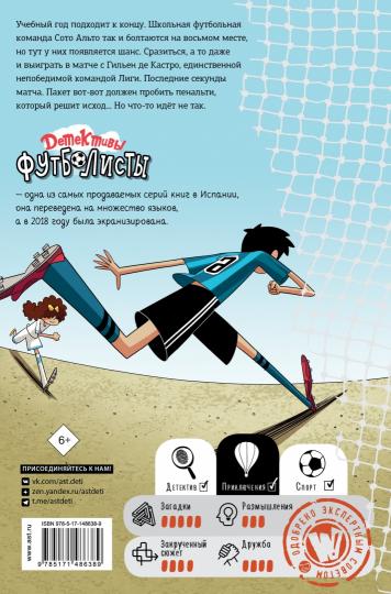 Учебный год подходит к концу. Школьная футбольная команда Сото Альто так и болтаются на восьмом месте, но тут у них появляется шанс. Сразиться, а то даже и выиграть в матче с Гильен де Кастро, единственной непобедимой командой Лиги. Последние секунды матча. Пакет вот-вот должен пробить пенальти, который решит исход... Но что-то идёт не так.Роберто Сантьяго работал сценаристом на телевидении, редактором и продюсером.Серия про детективов-футболистов стала настоящим культурным феноменом, это одни из самых продаваемых книг в Испании, они переведены на разные языки мира, а в 2018 году даже были экранизированы.Для среднего школьного возраста.