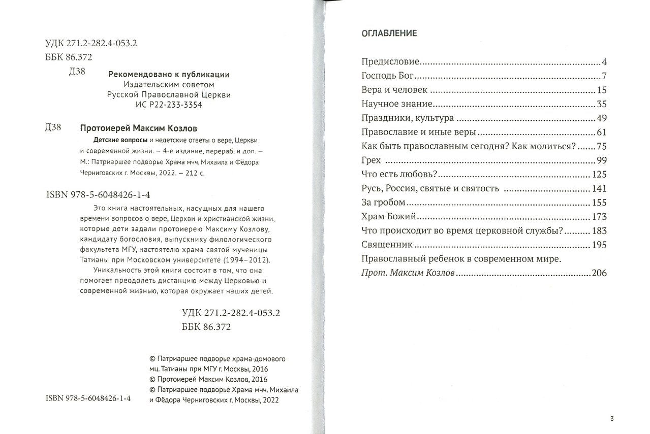 Handling time: 19 days Книга "Детские вопросы и недетские ответы о вере, Церкви и современной жизни" подготовлена протоиереем Максимом Козловым, кандидатом богословия, выпускником филологического факультета МГУ, настоятелем храма святой мученицы Татианы при Московском университете (1994-2012), и составлена из настоятельных, насущных для нашего времени вопросов, которые ему задавали школьники.Что происходит в храме, из чего состоит Причастие, когда будет конец света, как стать священником, какую музыку можно слушать?.. Конечно же, многие вопросы о главном в жизни остались неизменными. Однако появились новые проблемы, с которыми сталкиваются дети. За последние годы в нашу жизнь активно вошел Интернет. Что стоит за общением в социальных сетях и как к этому относиться? Как не потеряться в океане информации? Как жить подростку в современном мире, если он хочет быть православным? Как православному молодому человеку следует относиться к различным явлениям современной жизни?Уникальность издания состоит в том, что оно помогает преодолеть дистанцию между Церковью и современной жизнью, которая окружает подрастающее поколение. Много нового, интересного и полезного найдут для себя в этой книге не только дети, но и их родители, бабушки и дедушки.3-е издание, переработанное и дополненное.
