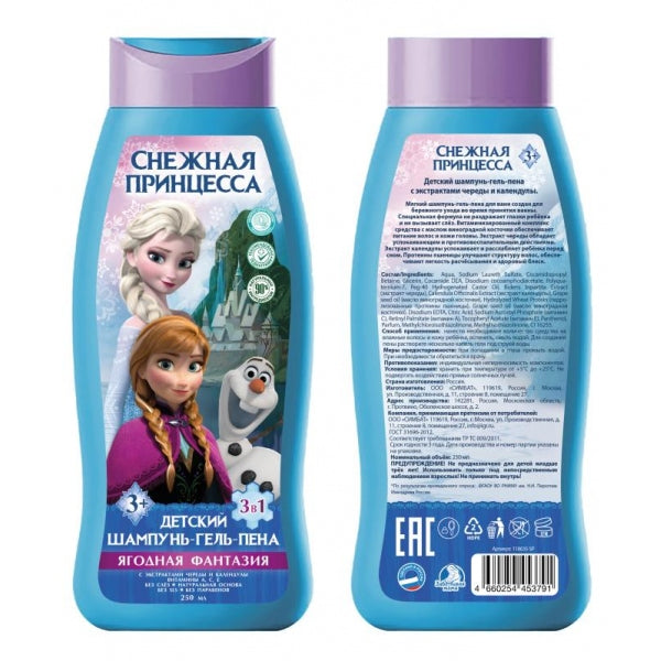 Дет шамп-гель-пена снеж принцесса,3в1 с чер и кален, ягод фан,250мл Заботливая мама в кор.6шт