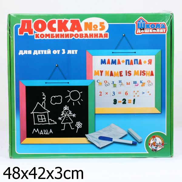 Доска комбинированная для рисования №5. Состав: доска комбинированная, мел, тряпка, маркер на водной основе, набор букв русского алфавита, цифры, знаки, карточки из полимерного материала с буквами английского алфавита, магниты-вкладыши, карточки кассы букв и цифр, комплект магнитов с клеевым слоем. Материал: картон, пластик, магнит, полимерный материал, мел. Рекомендовано для детей от 3 лет. Развивает фантазию, помогает освоить алфавит, заканчивая рисованием.