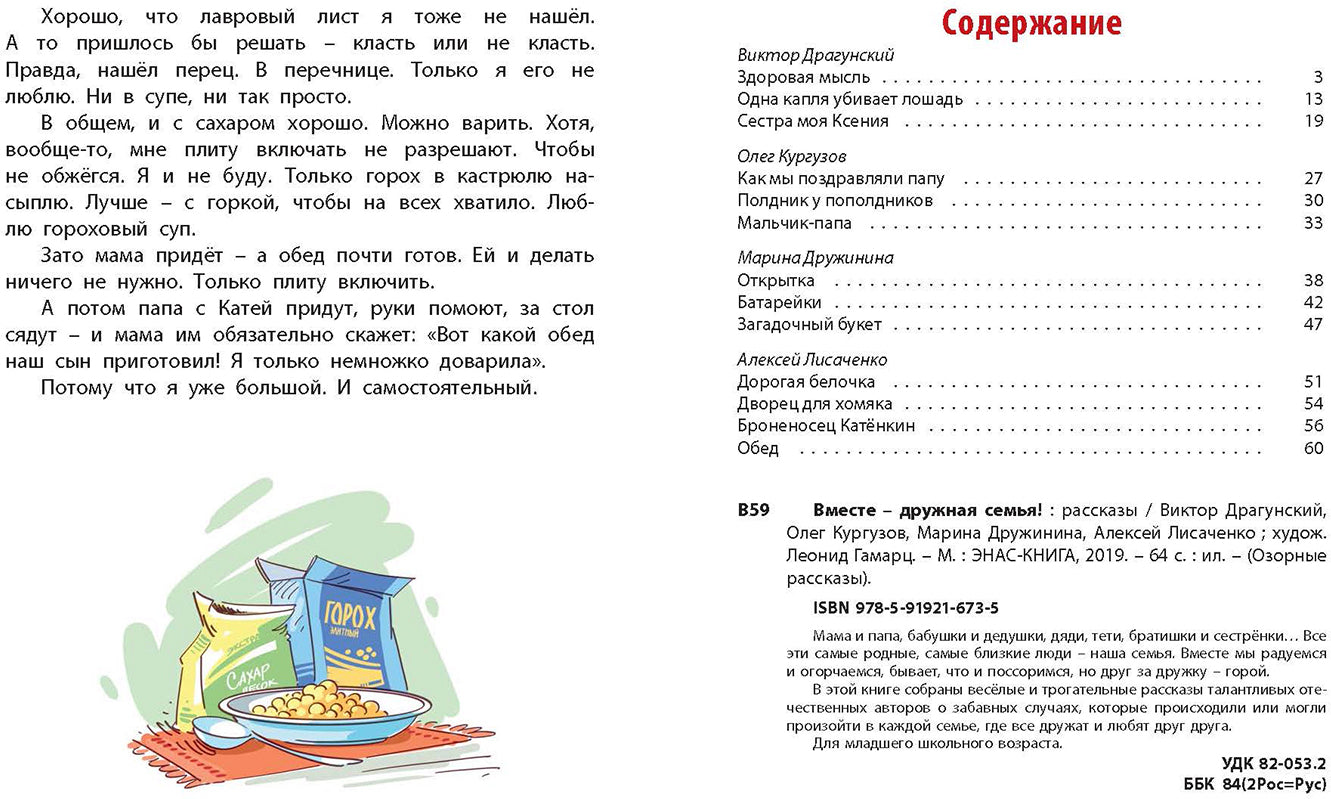 Мама и папа, бабушки и дедушки, дяди, тети, братишки и сестрёнки… Все эти самые родные, самые близкие люди - наша семья. Вместе мы радуемся и огорчаемся, бывает, что и поссоримся, но друг за дружку - горой!В этой книге собраны весёлые и трогательные рассказы талантливых отечественных авторов о забавных случаях, которые происходили или могли произойти в каждой семье, где все дружат и любят друг друга.СодержаниеВИКТОР ДРАГУНСКИЙЗдоровая мысль Одна капля убивает лошадь Сестра моя Ксения ОЛЕГ КУРГУЗОВКак мы поздравляли папуПолдник у пополдников Мальчик-папа МАРИНА ДРУЖИНИНАОткрытка Батарейки Загадочный букет АЛЕКСЕЙ ЛИСАЧЕНКОДорогая белочка Дворец для хомяка Броненосец Катёнкин Обед Для младшего школьного возраста.