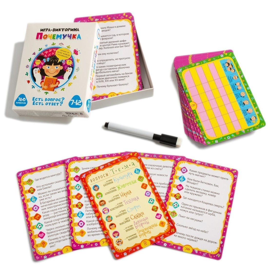 Handling time: 19 days Занимательная игра-викторина поможет проверить знания в разных областях: спорт, техника, культура, наука, животные, сказки, «девичьи» вопросы, ну и конечно, «почемучкины» вопросы для самых любознательных! Всего более 700 вопросов. В комплекте — мини игровые поля и маркер для записи очков и использованных подсказок.Знаешь ли ты…… почему у зайца длинные уши?… как называется «русский бейсбол»?… можно ли взвесить молекулу?… почему булькает болото?… зачем крокодилы глотают камни?… почему лук заставляет нас плакать?В комплекте: 50 карточек, маркер, правила.Размер карточки — 9х13 см.Количество игроков: 2–6 человек.Возраст: 7–12 лет.Сделано в России.